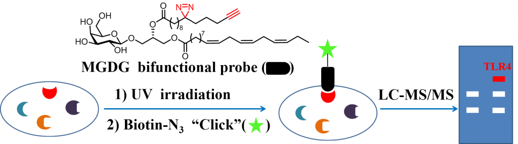 Glycolipids are important structural components of biological membranes and perform crucial functions in living systems, including signaling transduction and interaction with extracellular environment. However, the mechanistic exploration of glycolipids in vivo is challenging because they are not genetically encoded. Herein, we designed and synthesized a series of bifunctional monogalactosyldiacylglycerol (MGDG) probes as a model by introducing diazirine and terminal alkyne moieties on an aliphatic chain. In combination with proteome profiling and molecular modeling, we have demonstrated that MGDG alleviates inflammation by antagonizing TLR4.